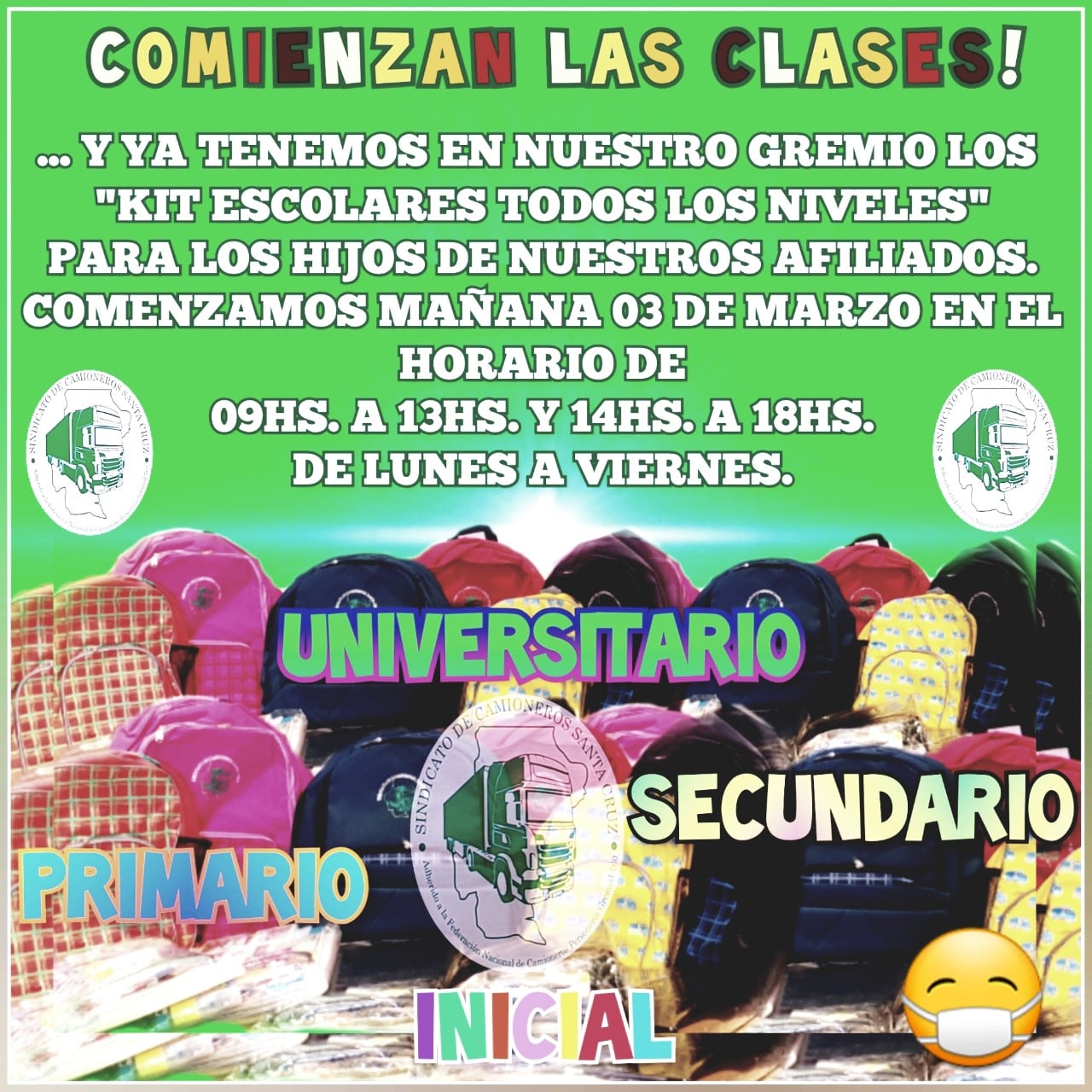 Compañeras y compañeros, Les comentamos que mañana 03 de marzo comenzamos en todas las delegaciones de #camionerossantacruz con la entrega de kit escolares todos los niveles para los hijos de nuestros afiliados . Por motivo de la pandemia y debidos protocolos es que les pedimos que sólo una persona por grupo familiar se acerque a retirar los…
