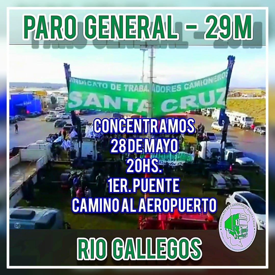 Delegación Río Gallegos. Miércoles 29 de Mayo: “Paro General de Actividades” “Hay gremios que le esquivan al bulto; nosotros conocemos el reclamo de los trabajadores por el daño de las políticas económicas del gobierno y por eso nos sumamos a esta medida que va a ser muy contundente, para demostrar que hay una inmensa mayoría…