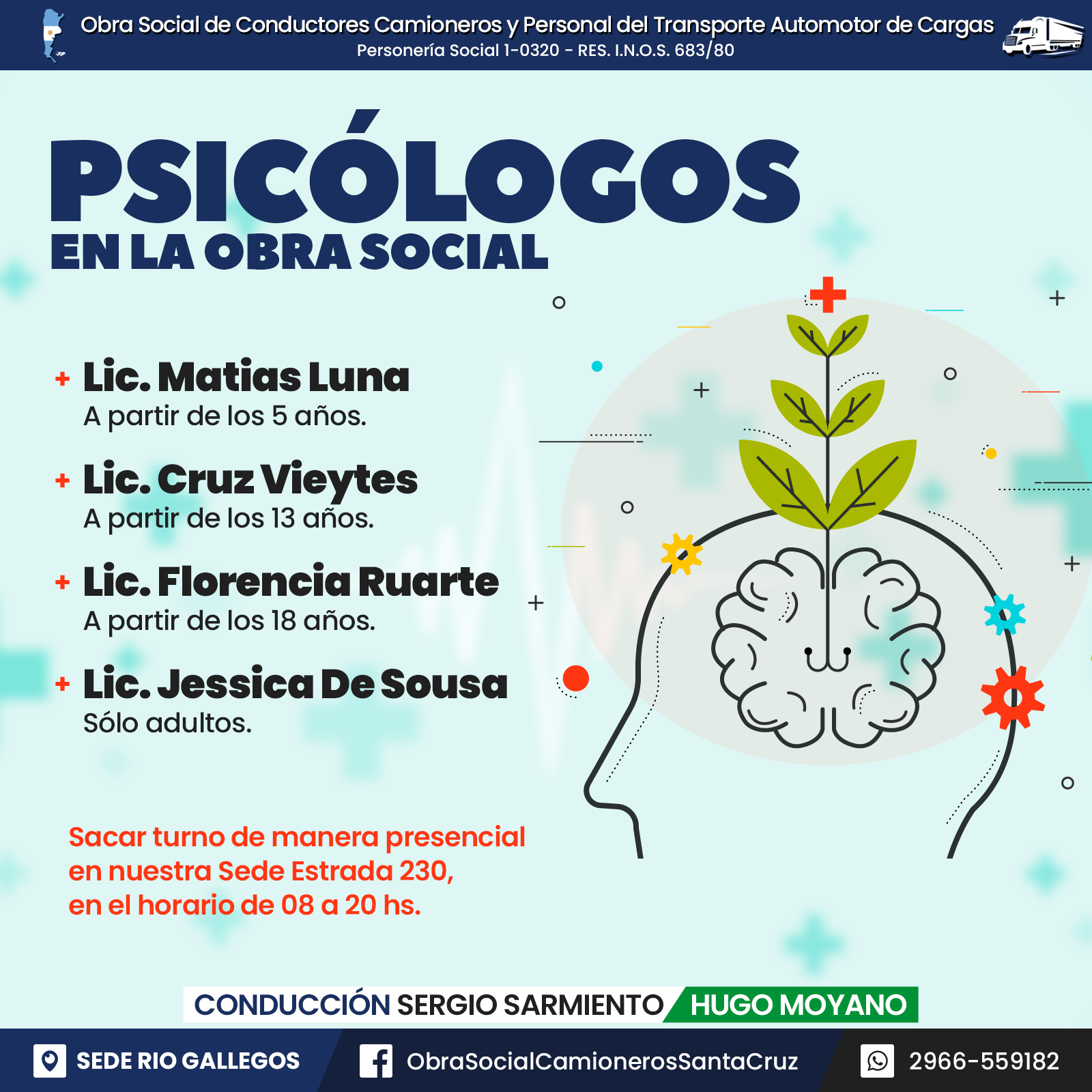 En la Obra Social contamos con un equipo de 4 Psicólogos que pueden ayudarte. Lic. Matías Luna, Lic. Cruz Vieytes, Lic. Florencia Ruarte y Lic. Jessica De Sousa. Para solicitar turno, tenés que acercarte a nuestra Sede en Estrada 230, en el horario de 08 a 20hs.