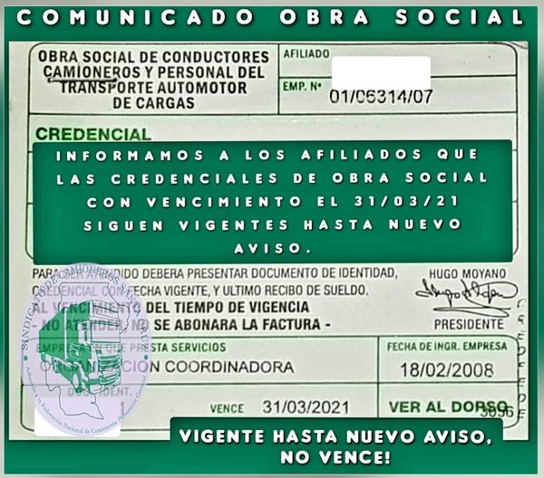 Obra Social informa a los Afiliados que las Credenciales de Obra Social con vencimiento el 31/03/21 siguen teniendo vigencia hasta nuevo aviso. #camionerossantacruz #hugomoyanoconduccion #SergioSarmientoConduccion