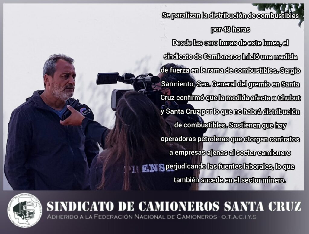 Sergio Sarmiento, Secretario General de la Provincia de Santa Cruz confirmó que la medida afecta a Chubut y Santa Cruz por los que no habrá distribución de combustibles. Sostiene que hay operadoras petroleras que otorgan contratos a empresas ajenas al sector camioneros perjudicando de esta manera las fuentes laborales, lo que también sucede con el sector minero.-